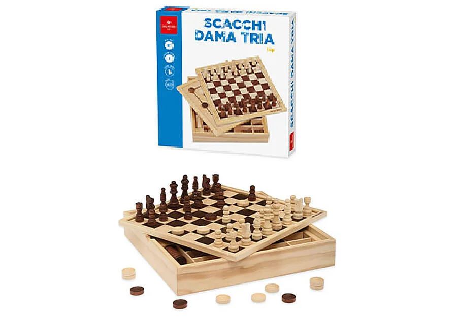 Contenuto: Serie completa pezzi Scacchi, Serie pedine Dama/Tria, Regolamento