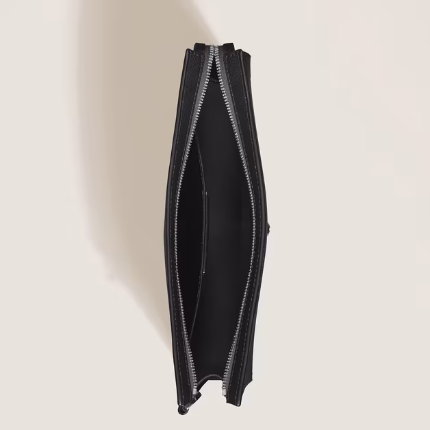 La sua versatilità è massima: grazie al cinturino amovibile, può essere portata elegantemente al polso, tenuta a mano o sotto il braccio, adattandosi con naturalezza a ogni situazione professionale o di viaggio. Lo scomparto principale è ottimizzato da una tasca supplementare aperta, garantendo un’organizzazione impeccabile in soli 300 grammi di peso