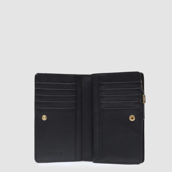 L’architettura interna è studiata per le esigenze della donna moderna: vanta ben 10 fessure dedicate per le carte di credito, permettendo di tenere in ordine tessere fedeltà e documenti, oltre a un pratico portamonete integrato e un ampio scomparto per le banconote. Come ogni pezzo della linea W92, la sicurezza è al primo posto: la protezione RFIDscherma l’intero contenuto da scansioni illecite, combinando lo stile sofisticato di Piquadro con la massima tranquillità digitale.